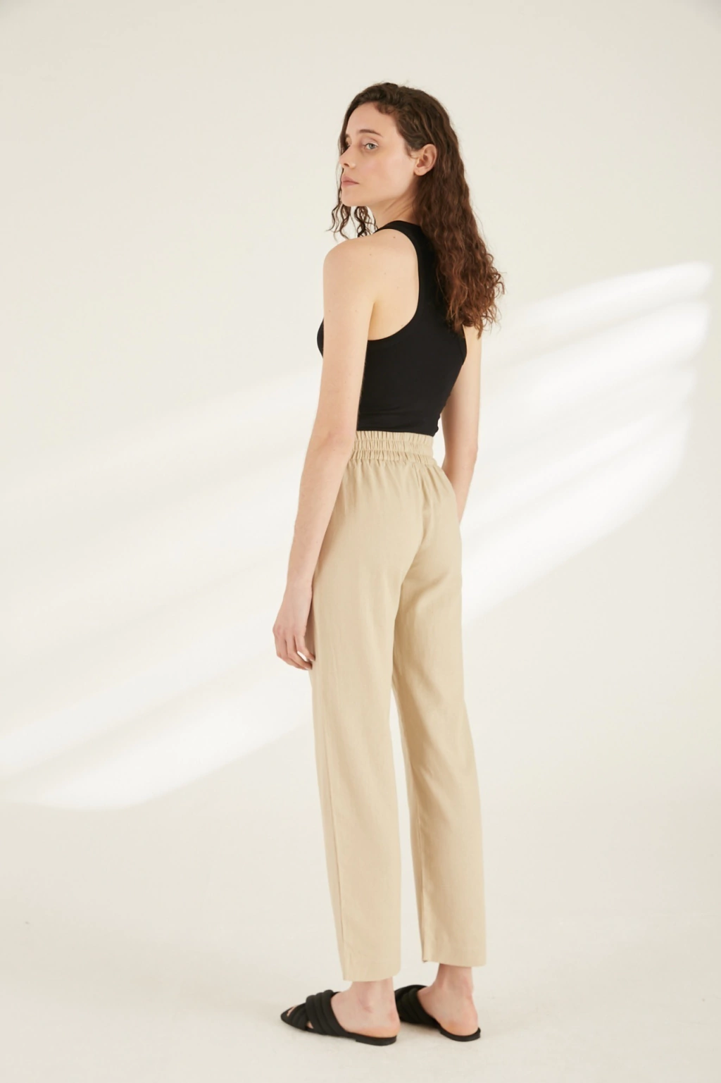 El pantalón Rodano es un pantalón de tiro alto confeccionado en lino mezcla, de corte recto y cintura elastizada que le brinda una comodidad única. Fit comfy para todos los días. Te sugerimos como conjunto el saco Chablis.