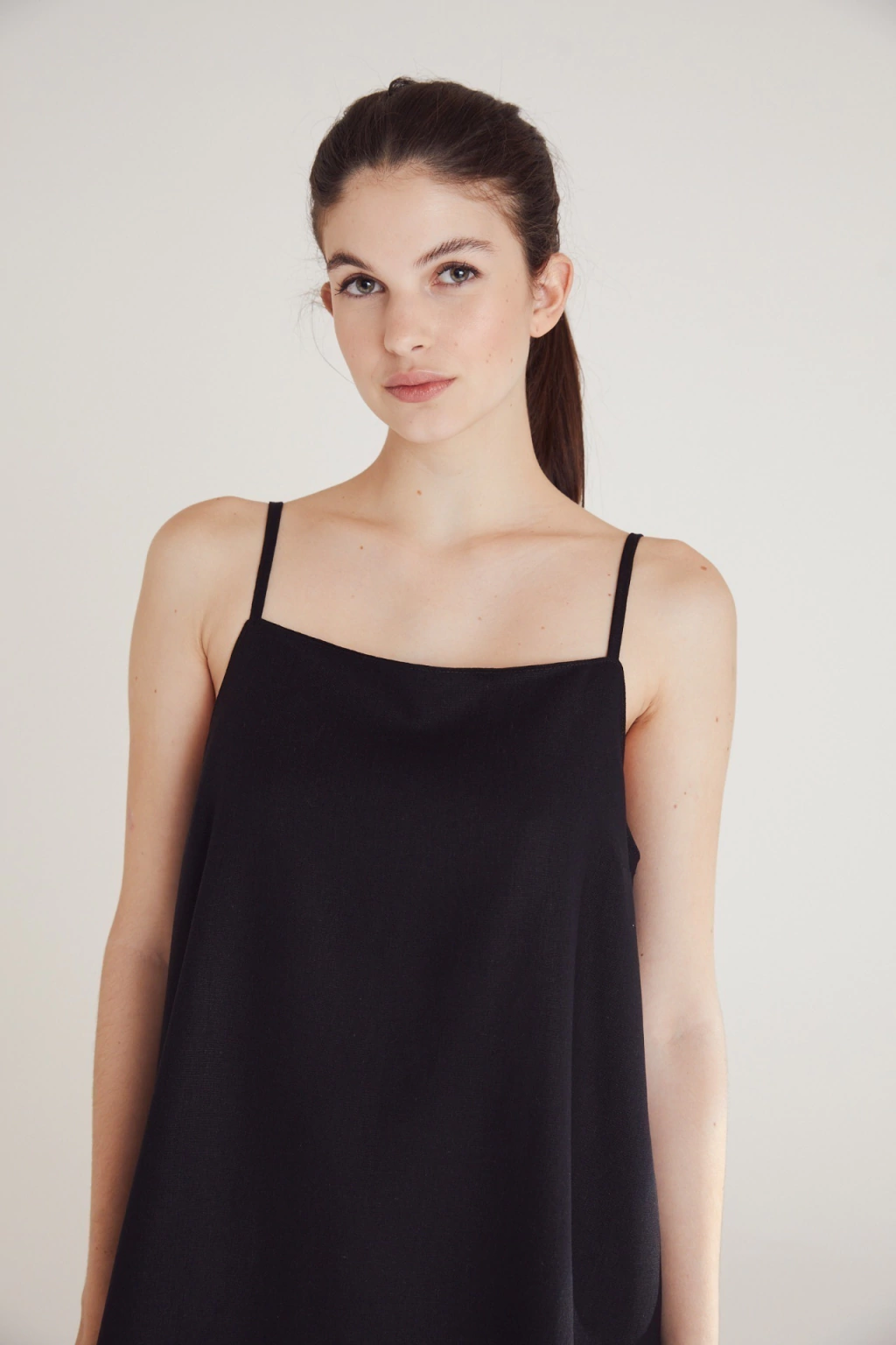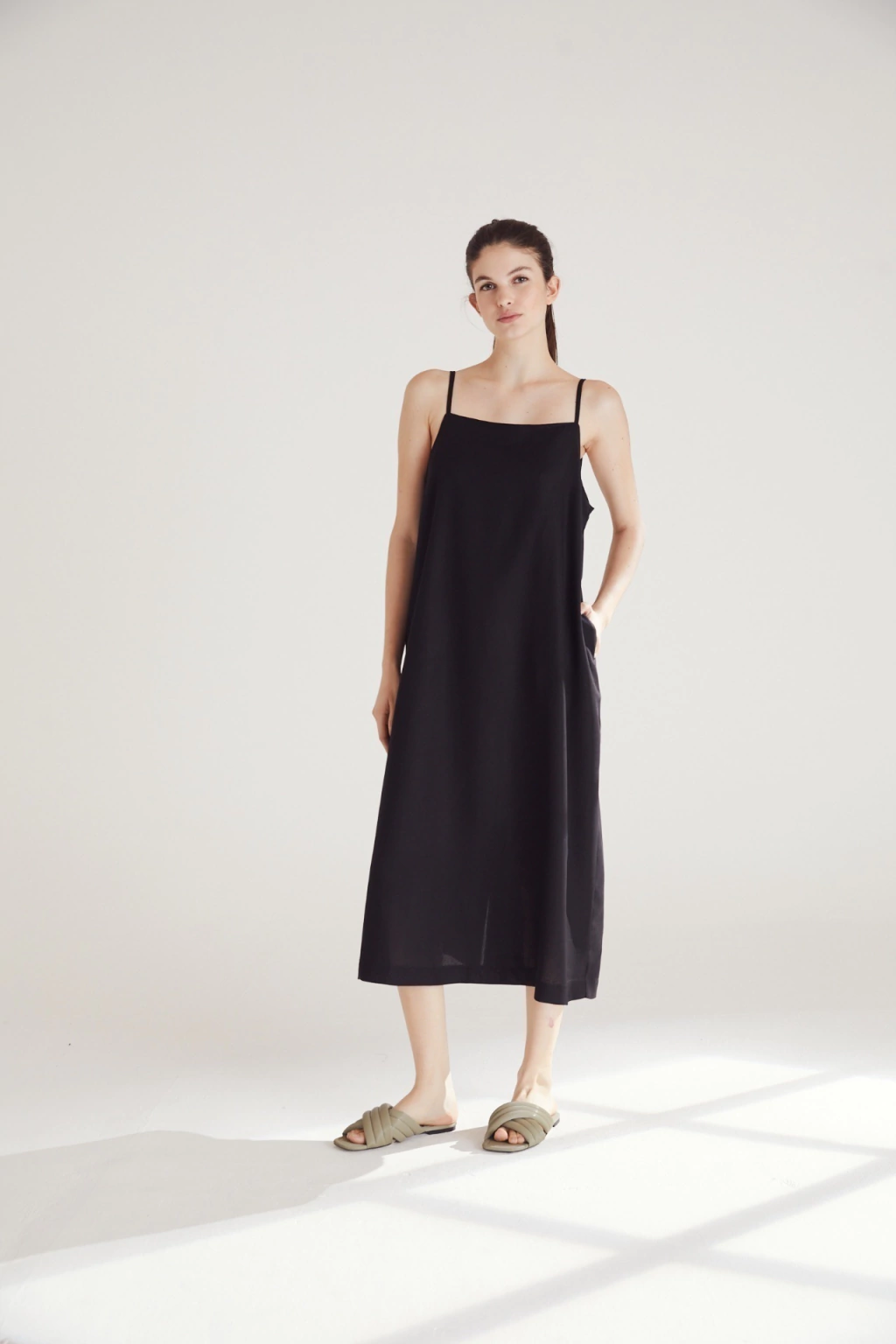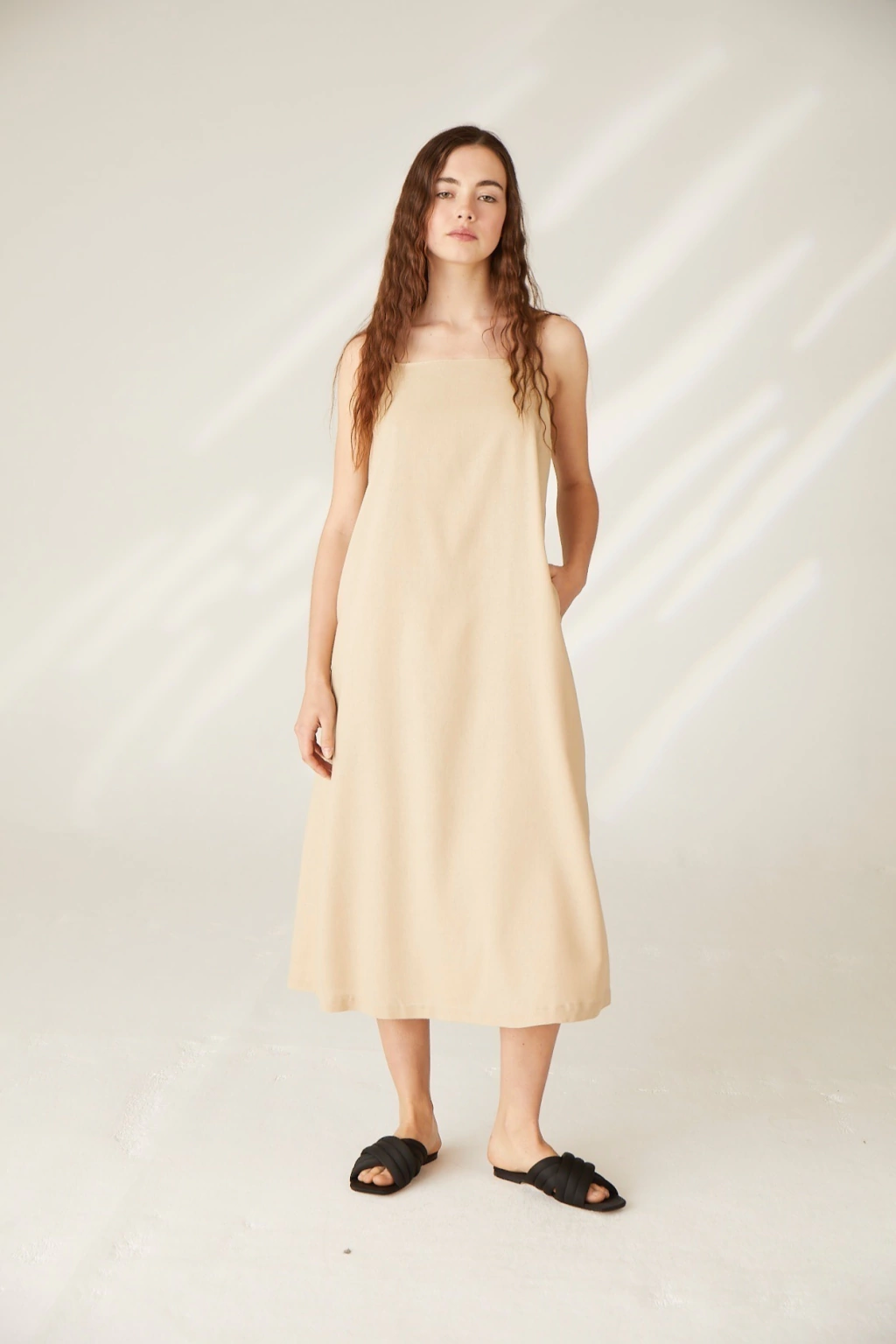 El vestido Malvy es un vestido largo confeccionado en lino mezcla con escote recto y breteles finos de la misma tela. Es largo hasta la altura de los tobillos y posee tajo en la parte posterior.